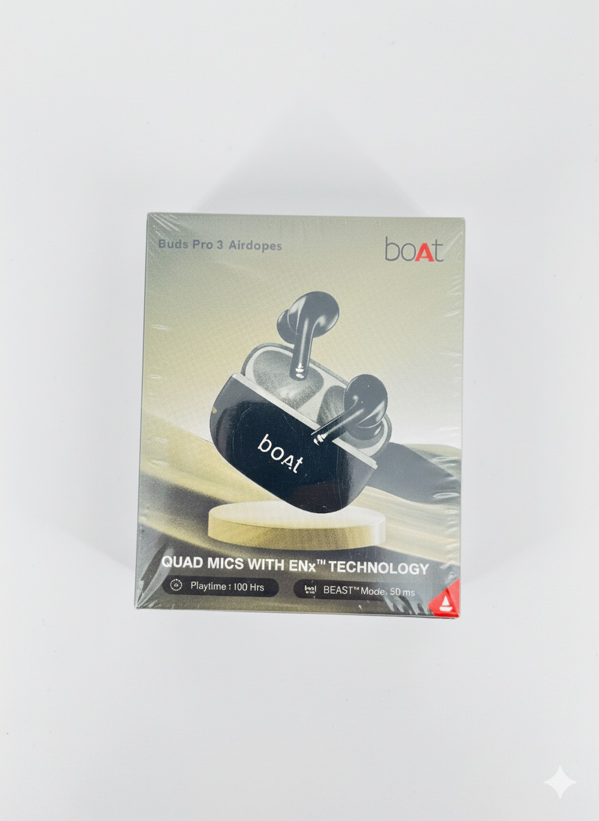The boAt Buds Pro 3 Airdopes deliver an exceptional audio experience with 46dB Hybrid Active Noise Cancellation for crystal-clear sound. Enjoy 100 hours of uninterrupted playtime, with a quick 10-minute charge providing 180 minutes of playback. Featuring 24-bit boAt Spatial Audio, seamless multipoint connectivity, and AI ENx Technology for clear calls in any environment, these earbuds are designed for high-performance and ultimate convenience.