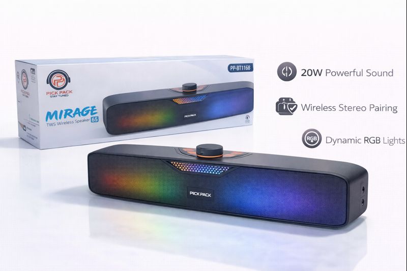 Pick Pack Miraje Wireless Speaker delivers rich, immersive sound with enhanced bass in a sleek and stylish design. Perfect for home, travel, and everyday music listening, it offers reliable Bluetooth connectivity and long playback time.