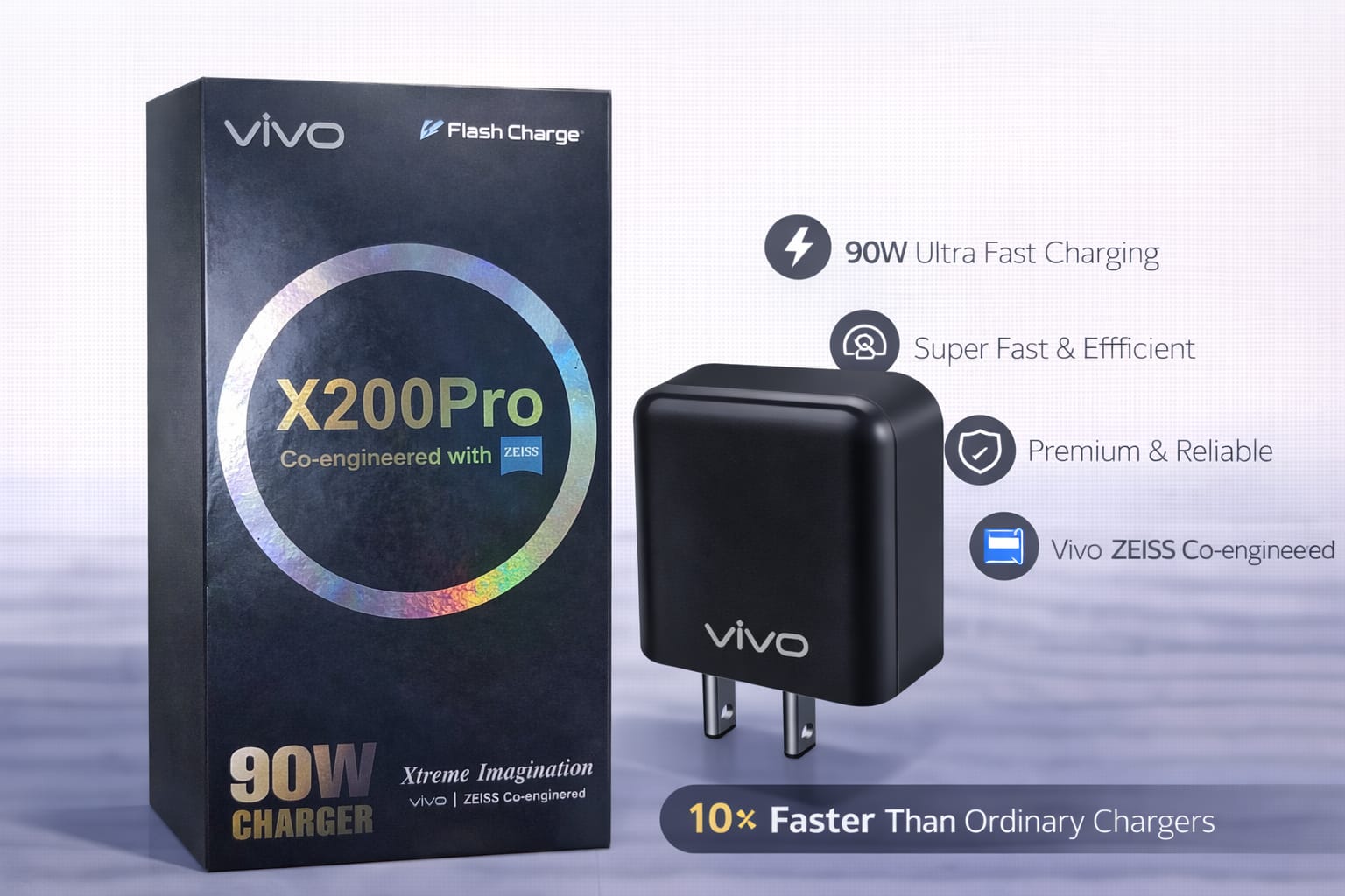 The Vivo X200 Pro supports 90 W FlashCharge wired charging when used with the original compatible adapter and USB-C cable included in the box. The phone dynamically adjusts power based on conditions for fast charging.