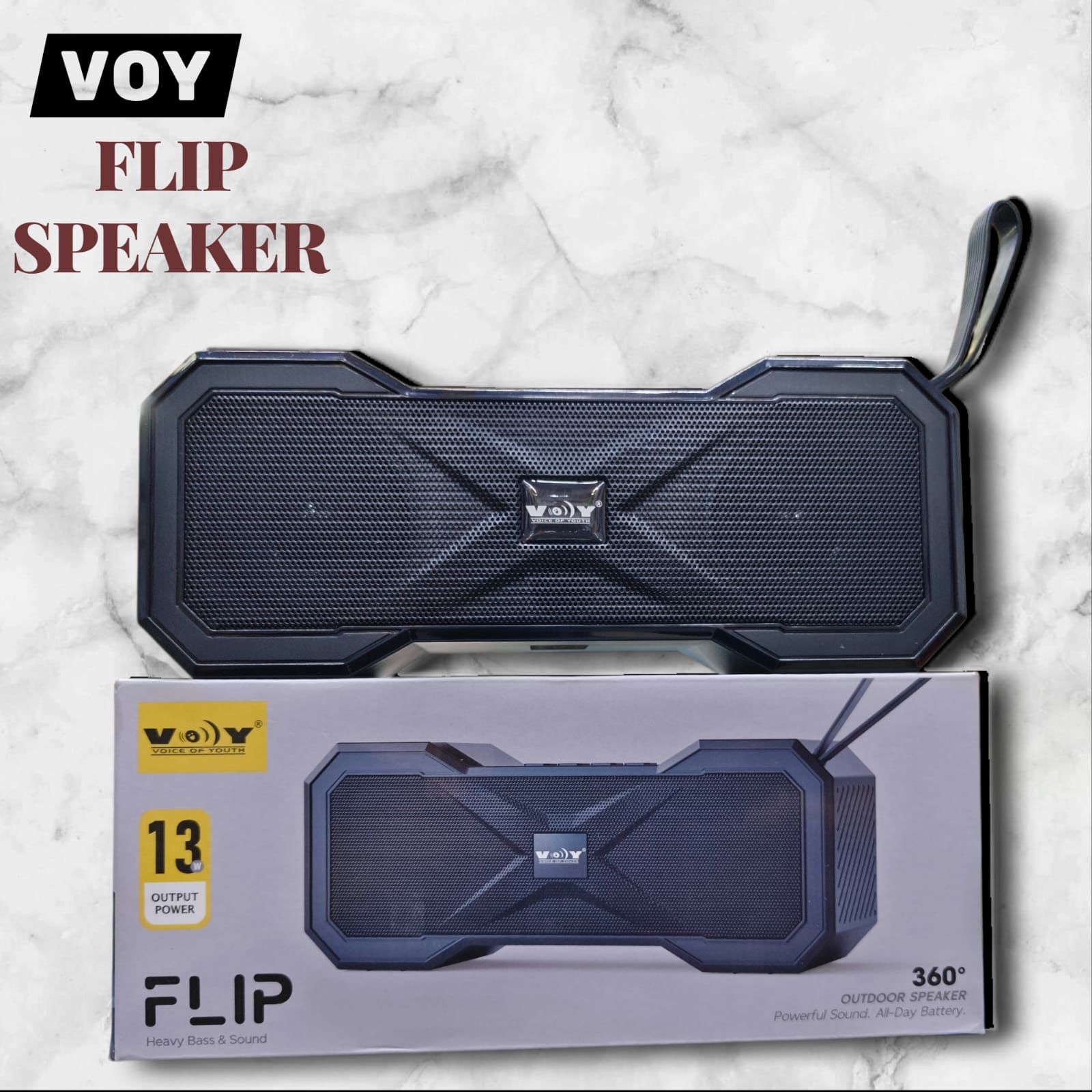 Voy Flip Speaker is a portable Bluetooth speaker designed for rich sound and deep bass in a compact flip-style form. Perfect for travel, parties, and everyday use, it offers reliable wireless connectivity and long-lasting playback.